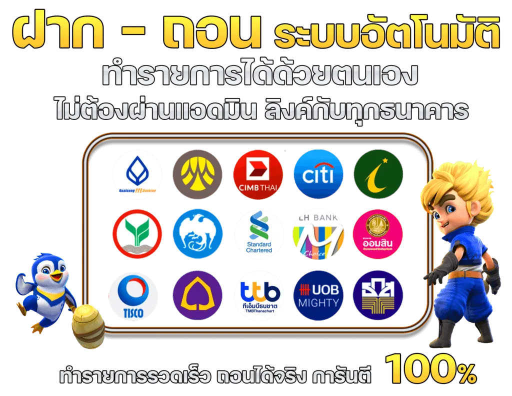 รองรับการฝากถอนผ่านทุกธนาคารชั้นนำในไทย และ TrueMoney Wallet โดยใช้ระบบอัตโนมัติทั้งหมด รวดเร็วภายใน 10 วินาที ไม่มีขั้นต่ำ